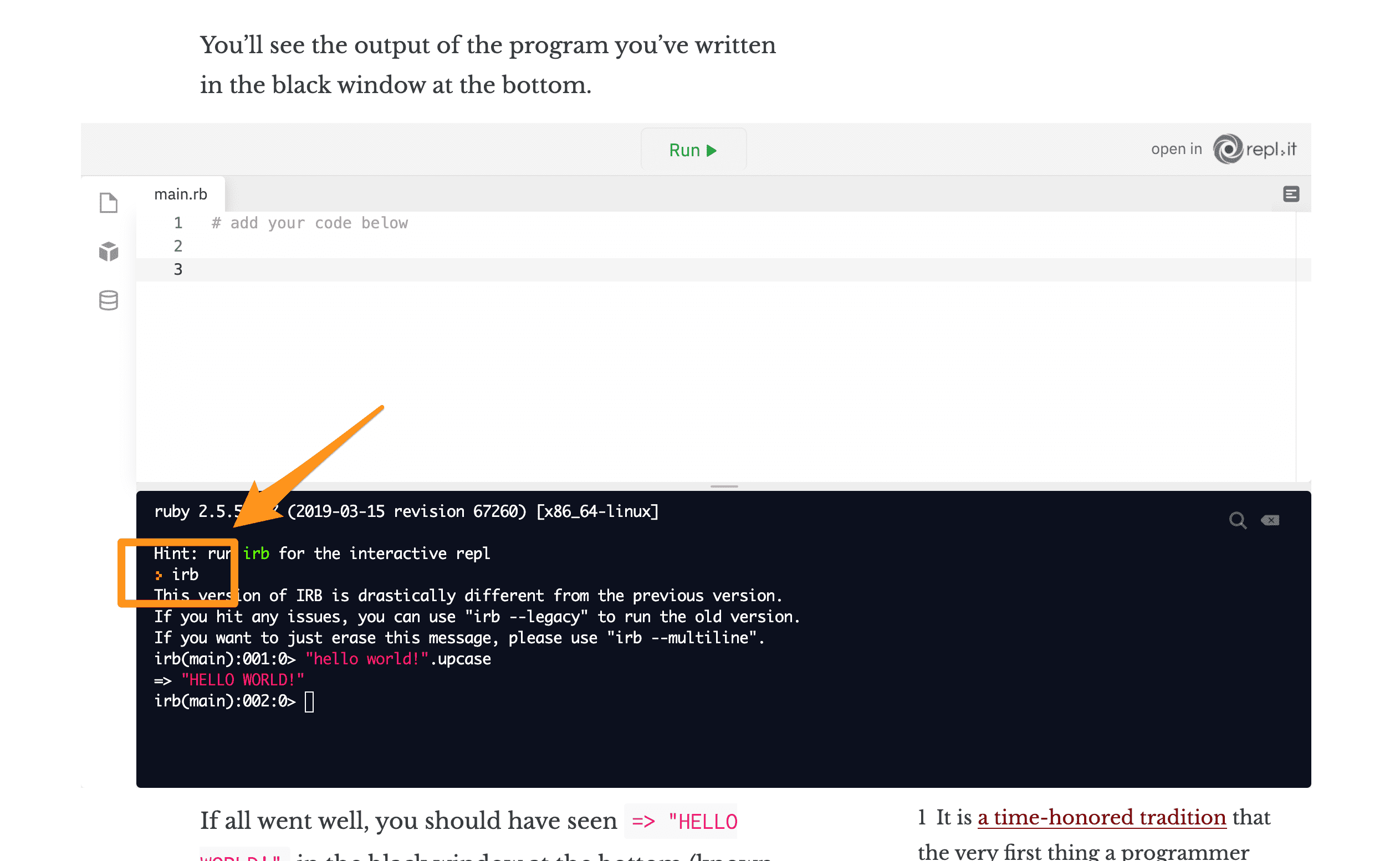 and press return. This will launch interactive Ruby (IRB), a program that lets you evaluate one Ruby expression at a time.
