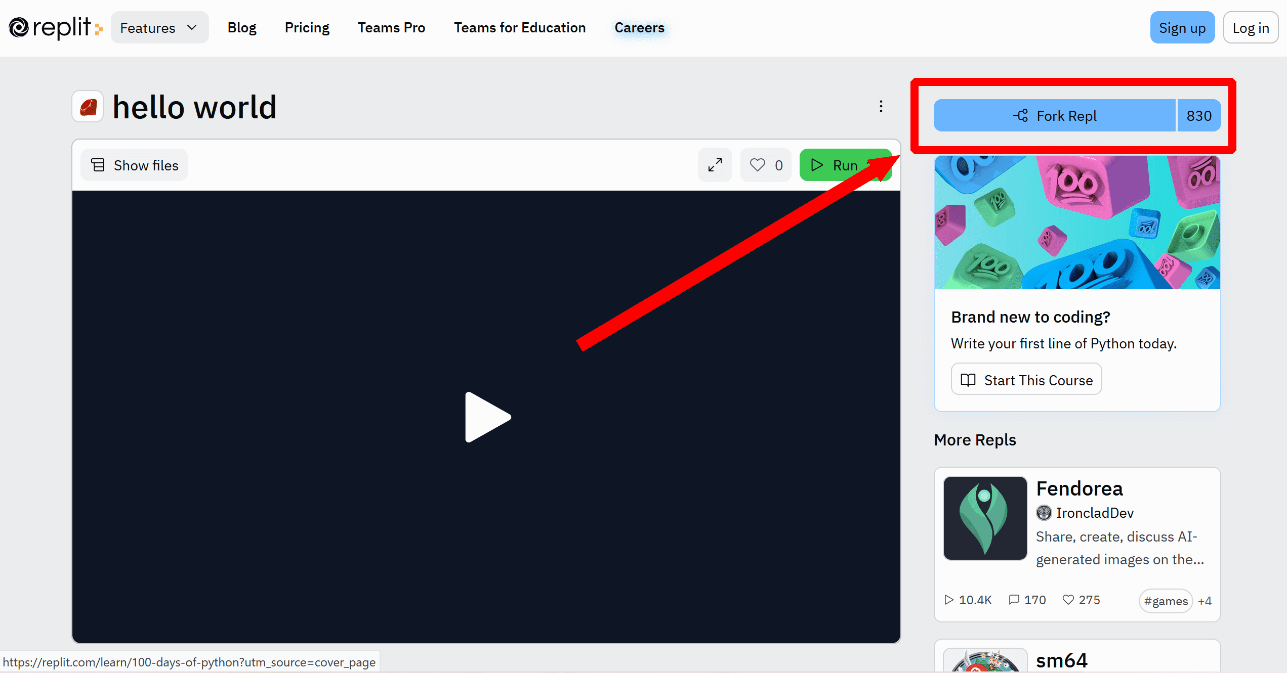 Here, you try it. Click here to visit repl.it, a service that offers instant programming sandboxes within your browser. Click the “Fork” button in the top right and sign in with your Github account.”Forking” a Repl will copy the Repl to your own account and allow you to edit it.