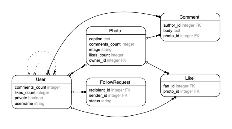 User#comments should return an array containing the records of the comments the user has made.User#own_photos should return an array containing the records of the photos posted by the user.User#likes should return an array containing the records of the likes created by the user.User#liked_photos should return an array containing the records of the photos the user has liked.User#commented_photos should return an array containing the records of the photos the user has commented on.User#sent_follow_requests should return an array containing the records of all of the follow requests that were sent by the user.User#received_follow_requests should return an array containing the records of all of the follow requests that were received by the user.User#accepted_sent_follow_requests should return an array containing the records of the follow requests that were sent by the user and accepted.User#accepted_received_follow_requests should return an array containing the records of the follow requests that were received by the user and accepted.User#followers should return an array containing the records of the people whose follow requests the user has accepted.User#following should return an array containing the records of the people that have accepted the user’s follow requests.User#feed should return an array containing the records of the photos posted by the people the user is following.User#discover should return an array containing the records of the photos that are liked by the people the user is following.Run rails grade when you’re ready to see how you’re doing.